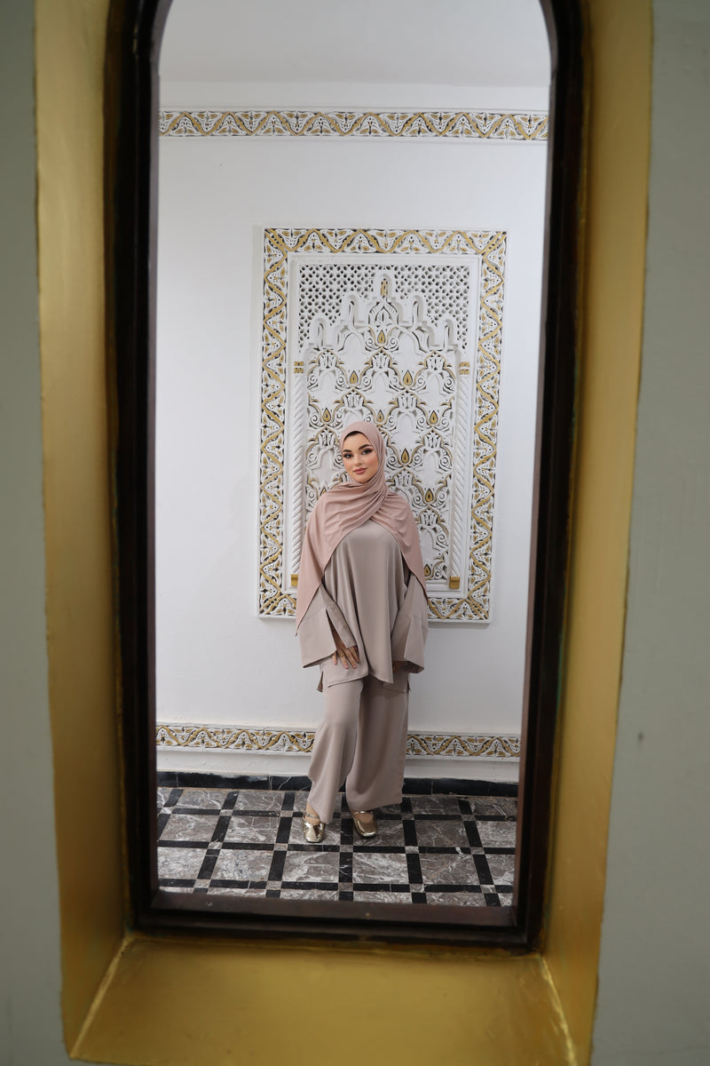The Crepe Two-Piece Set in Taupe is perfect for warm spring and summer days. It’s made from soft and breathable crepe fabric that feels light on the skin and flows beautifully as you move. The tunic has a loose and modest fit, giving you full coverage without feeling heavy. It’s finished with wide sleeves and a subtle stitched CHANO logo on the cuff for an elegant touch.