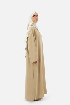 The Layered Abaya Set in Sand is a two-piece modest set consisting of an inner abaya and an outer open abaya. The inner abaya has a straight silhouette with a clean neckline and long sleeves, creating a simple and smooth base layer.