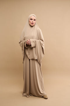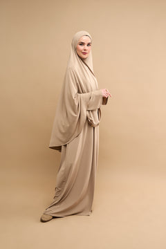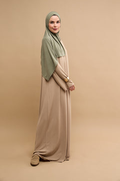 Our Premium Jersey Abaya in sand is crafted from the same buttery-soft premium jersey fabric as our Jersey Khimar. This lightweight, breathable material drapes beautifully and feels soft against the skin, making it perfect for everyday wear, all year round.