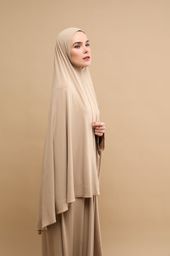 Our Premium Jersey Khimar in sand is crafted from the same high-quality premium jersey fabric as our Premium Jersey Hijabs. This khimar is soft, stretchy, breathable and wrinkle-resistant, ensuring a flawless drape and easy wear.